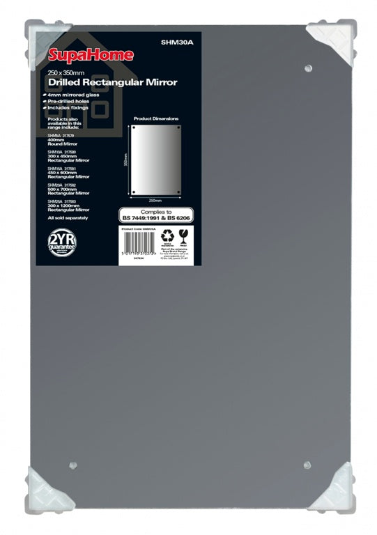 The SupaHome Drilled Rectangular Mirror collection offers a refined and practical solution for enhancing interior spaces with elegant reflective surfaces. Each mirror in the range is crafted from high-quality 4mm thick mirrored glass, precision-cut with pre-drilled holes for effortless installation. These mirrors comply with British safety standards BS 7449:1991 and BS 6206, ensuring durability, safety, and long-lasting clarity.