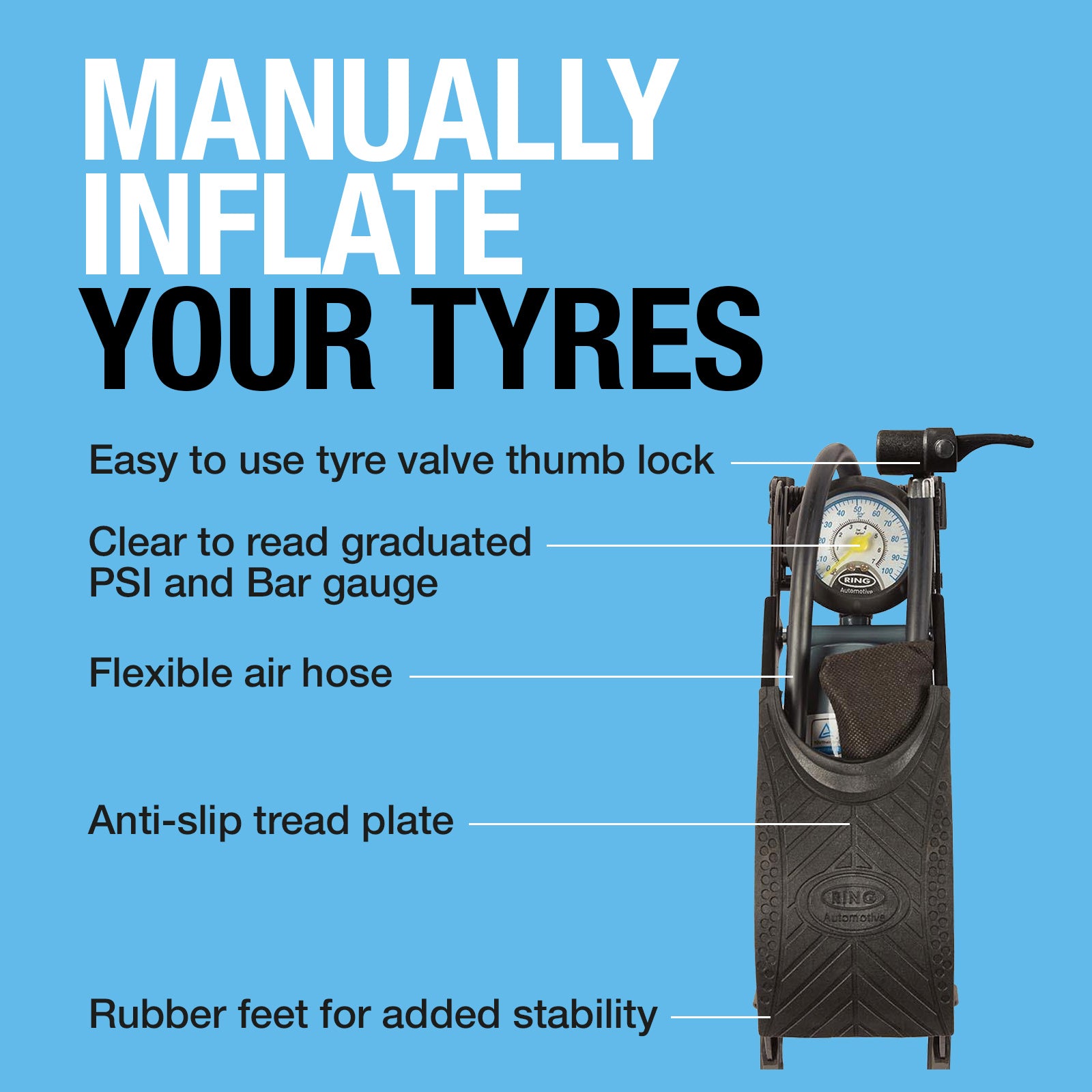 The Ring Single Barrel Footpump is a reliable and durable solution for inflating car tyres, bicycle tyres, and a variety of inflatables. Designed with user convenience and safety in mind, it features a non-slip footplate and a clear, easy-to-read pressure gauge for accurate inflation.
