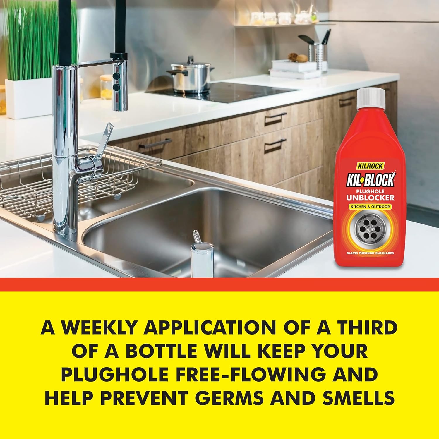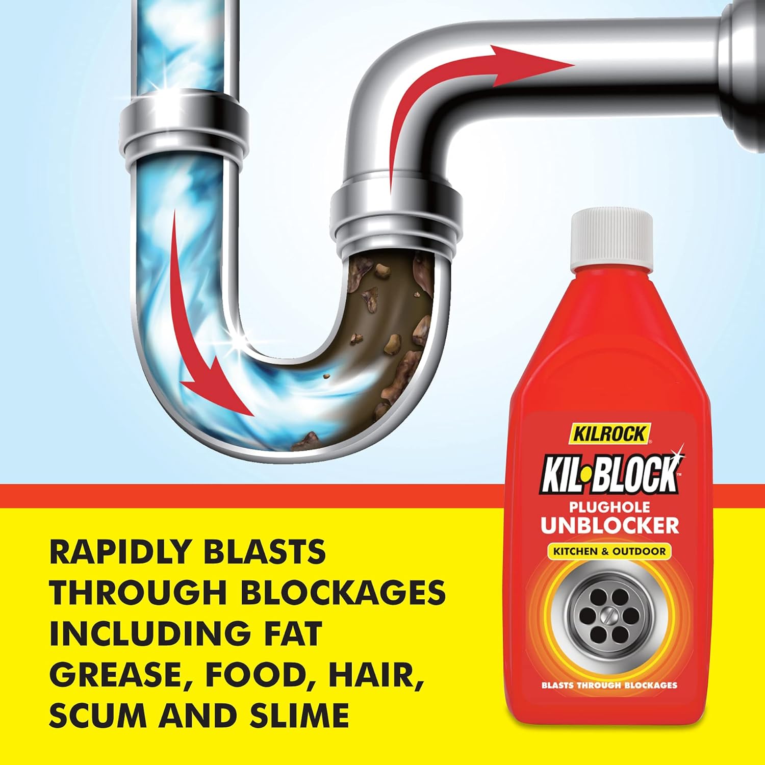 The Kilrock Kil-Block 500ml is a highly effective concentrated drain unblocker, designed to tackle even the toughest household blockages. Formulated to rapidly dissolve clogs caused by hair, grease, soap, food residue, and other common waste materials, Kil-Block restores free-flowing drainage with ease.