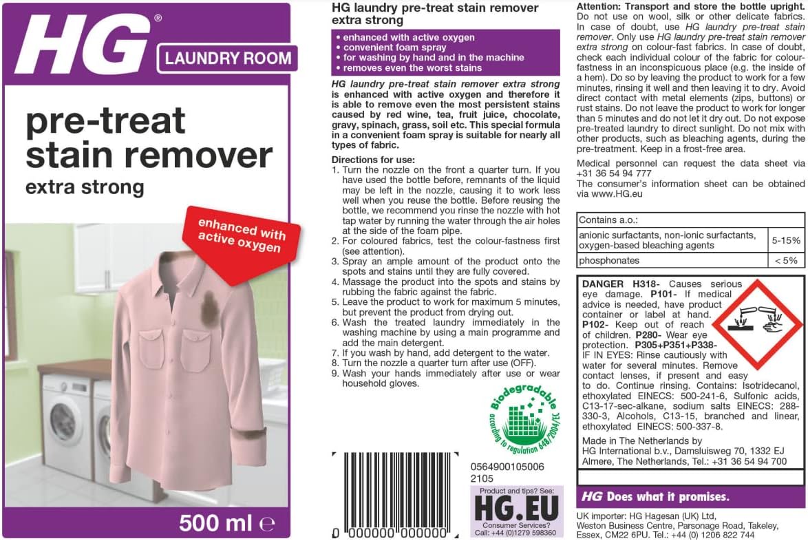 The HG Spots & Stains Prewash Spray is an extra-strong fabric stain remover designed to tackle even the toughest stains before washing. Formulated with active oxygen technology, it effectively removes red wine, tea, fruit juice, chocolate, gravy, spinach, grass, and soil stains from almost all textiles.