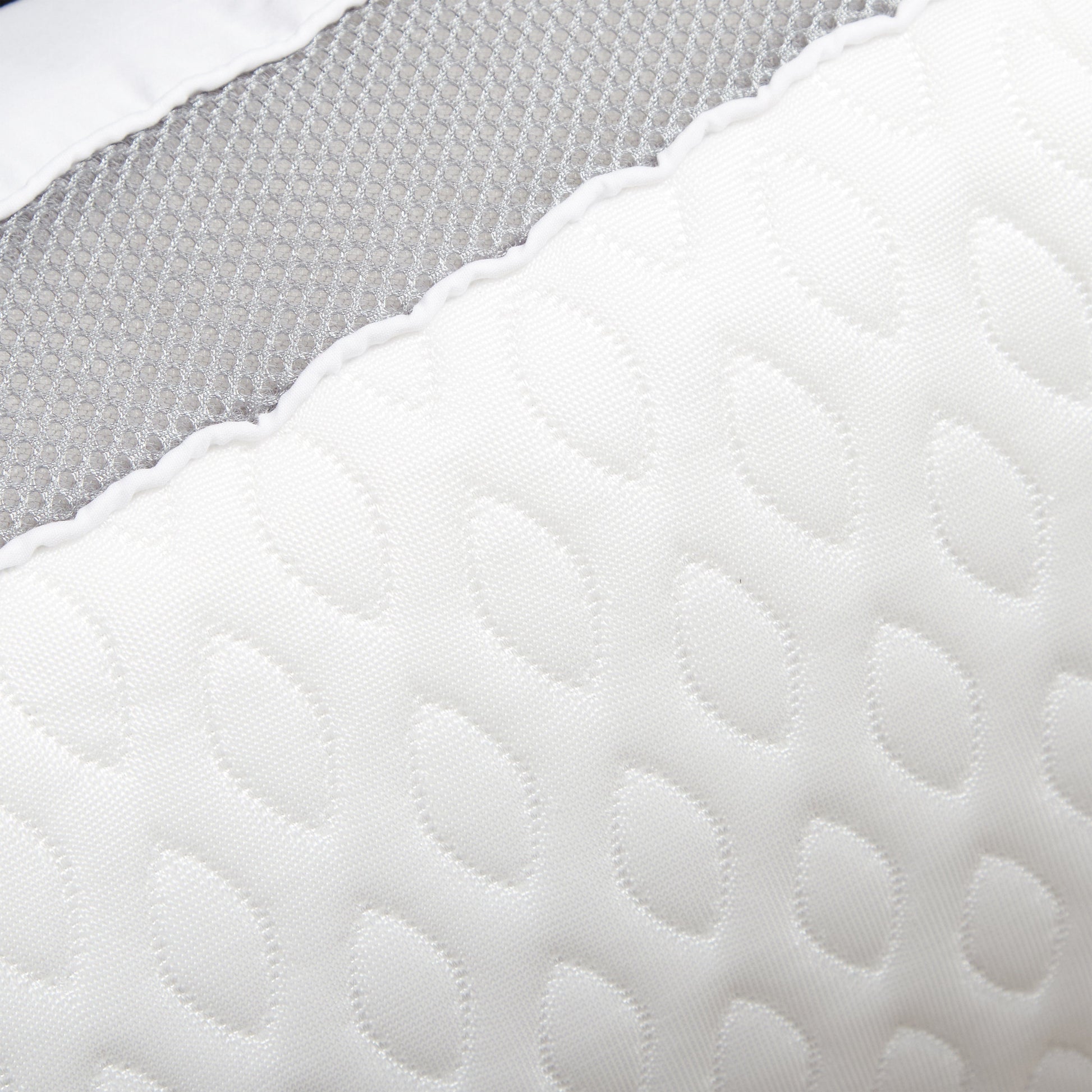 The Air Flow Pillow features a sophisticated white design with elegant piping along the edges, offering a clean and timeless aesthetic that complements any bedroom décor.
