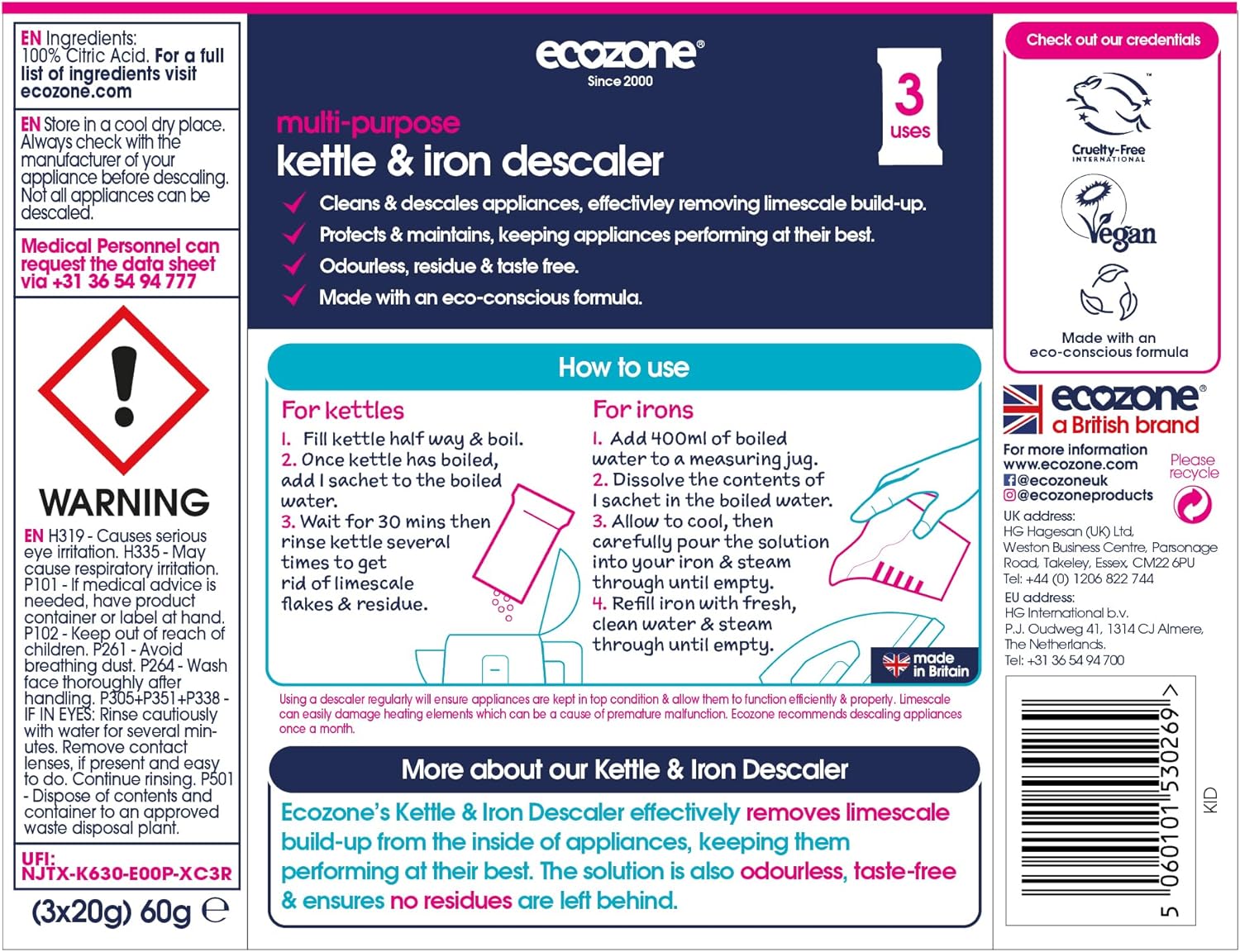 The Ecozone Kettle & Iron Descaler is a powerful, fast-acting solution designed to effectively remove limescale and mineral build-up from kettles, irons, and coffee machines. This eco-friendly formula restores appliance efficiency, helping to prolong their lifespan. Each pack contains three pre-measured sachets for easy use, making descaling simple and hassle-free.