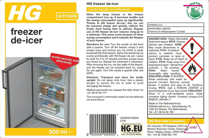 The HG Freezer De-Icer is a fast-acting solution designed to quickly remove ice build-up from freezers and deep freezers. By eliminating ice formation efficiently, it helps reduce energy consumption, saves money, and prevents frozen food from defrosting during the process.