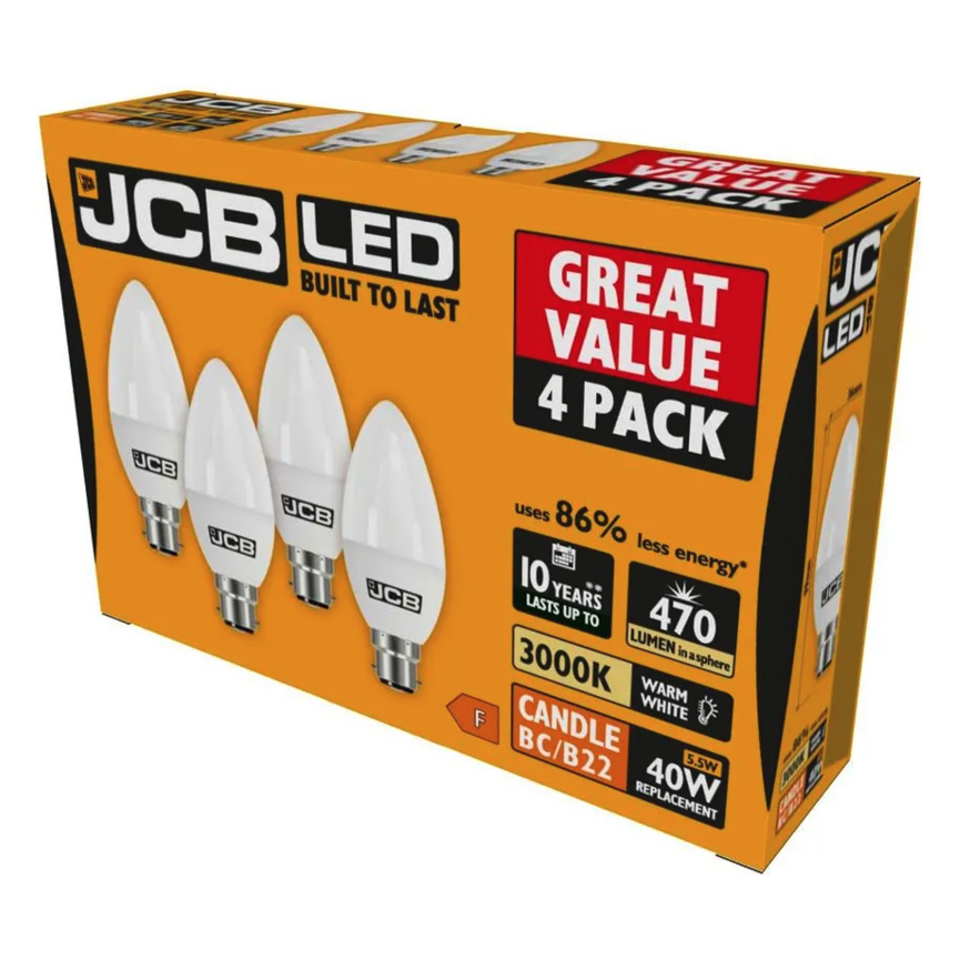 The JCB Candle BC 6W B22 LED Bulbs provide an elegant, warm lighting solution for a wide range of decorative applications. With energy-efficient performance and a classic candle design, this 4-pack is an excellent replacement for traditional 40W incandescent bulbs.