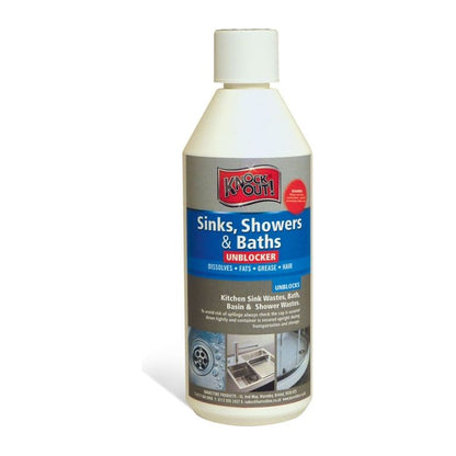 Tackle clogged sinks, blocked showers, and slow-draining baths with confidence using Knockout Sinks, Showers & Baths Unblocker. Specially formulated with sodium hydroxide, this fast-acting solution is designed to cut through and dissolve the toughest build-ups of fat, grease, hair, and soap scum commonly found in bathroom and kitchen pipework.