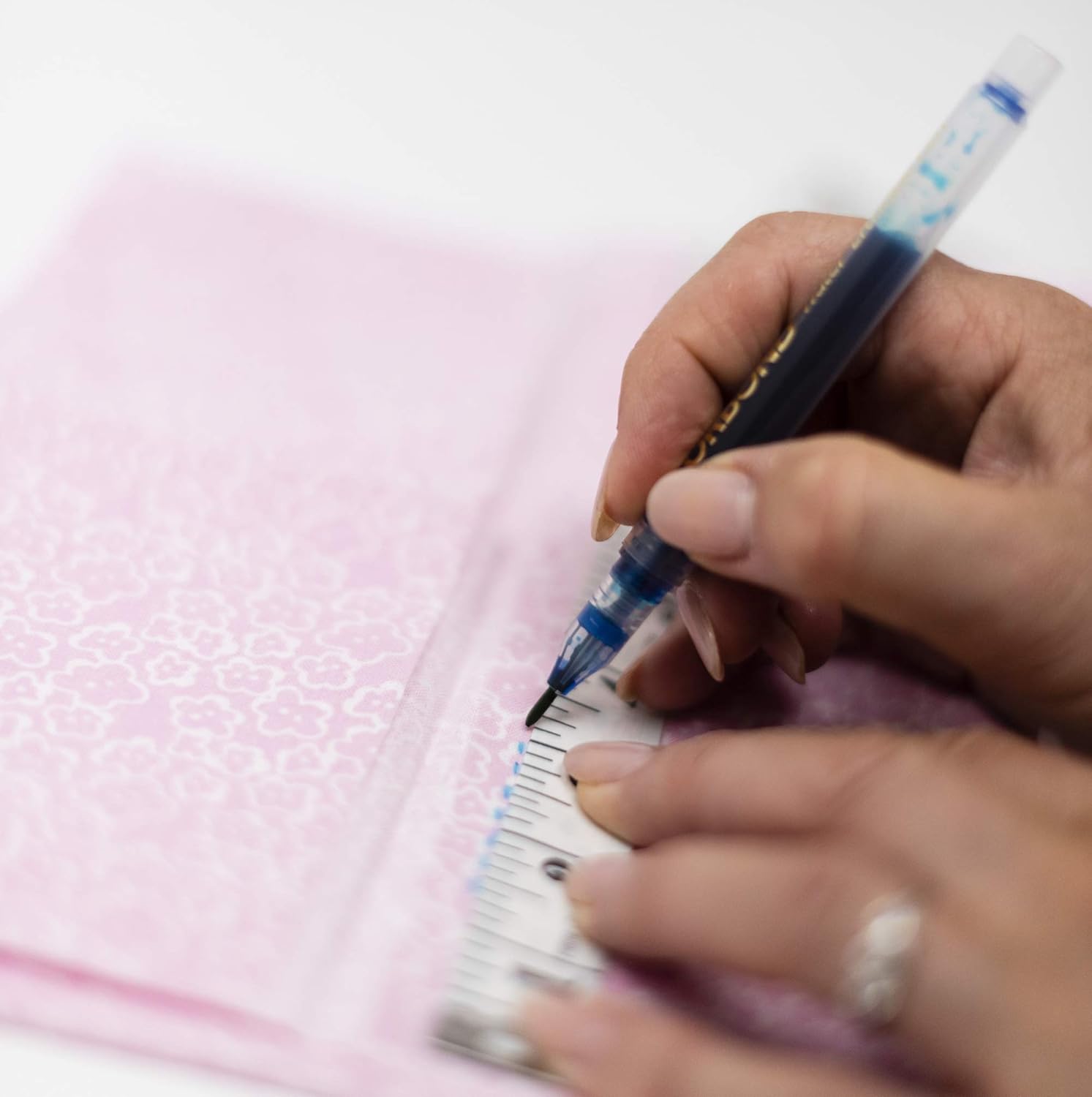 A: The visibility of the ink may vary depending on fabric colour. It works best on light to medium-toned fabrics. For darker fabrics, consider a tailor’s chalk or a white fabric marker.