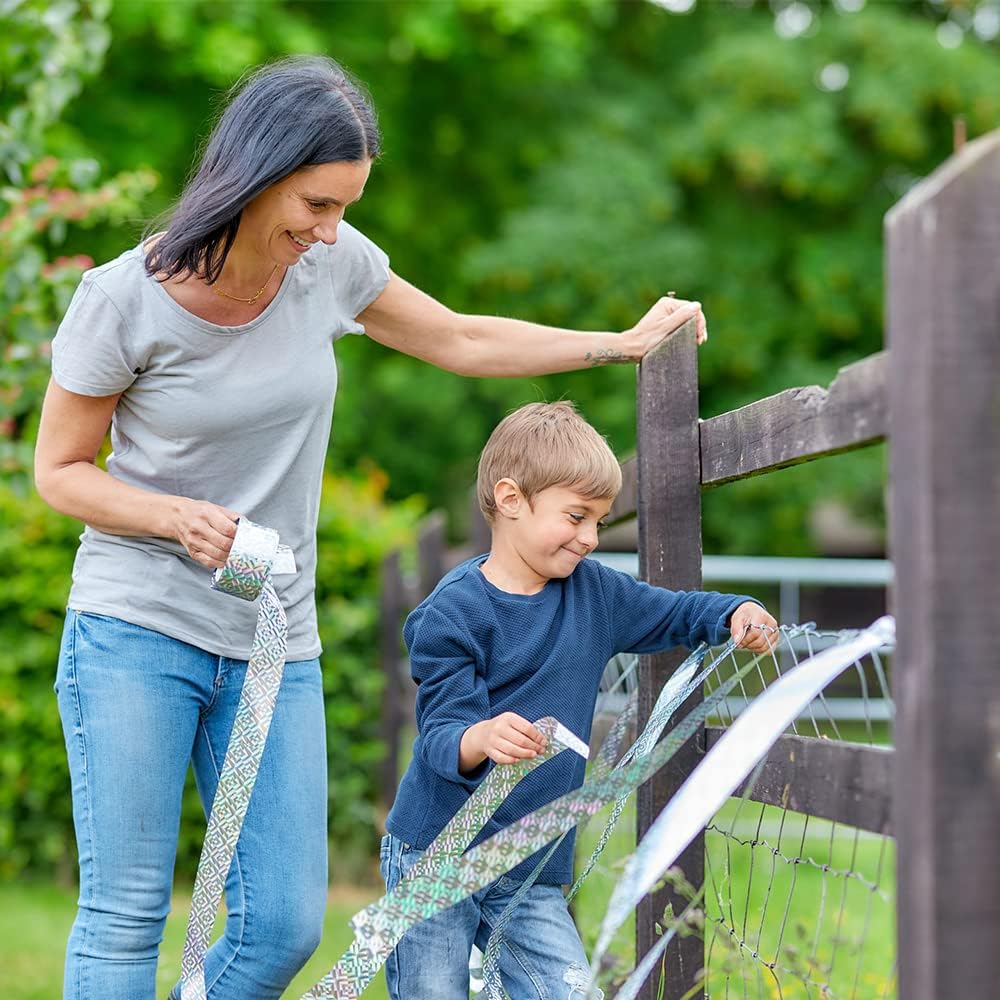 ✔ Iridescent Flashing Tape – The shimmering light reflection and movement naturally deter birds, deer, and other animals.