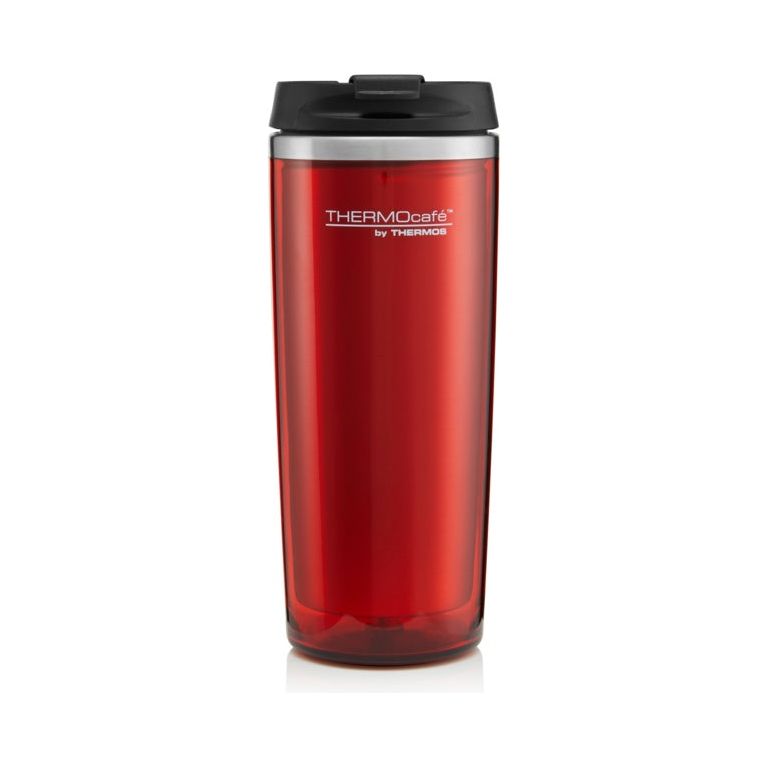 Thermos ThermoCafe Travel Tumbler – Red 350ml 1.5kg Stainless steel interior, plastic exterior Flip-top lid with rubberized press-fit closure Double-wall insulation