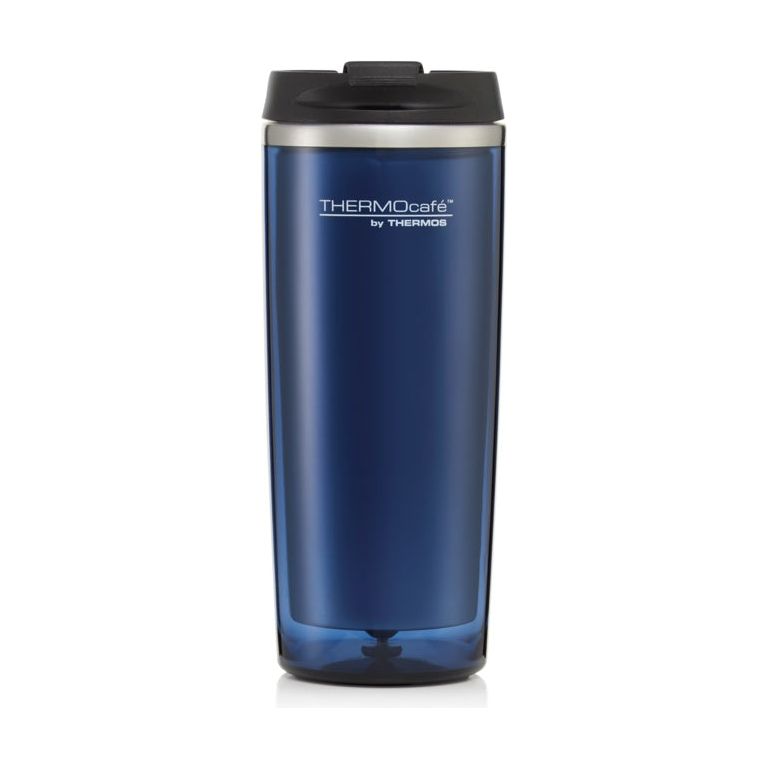 Thermos ThermoCafe Travel Tumbler – Midnight Blue 350ml 1.5kg Stainless steel interior, plastic exterior Flip-top lid with rubberized press-fit closure Double-wall insulation