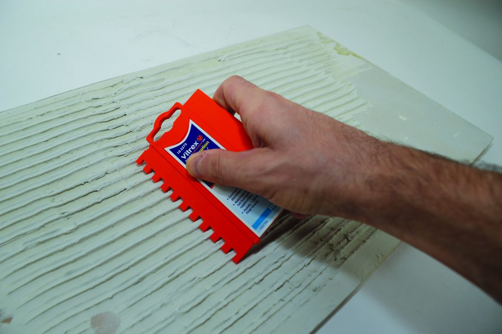 Use the notched edge at a 45-degree angle for smooth adhesive application.