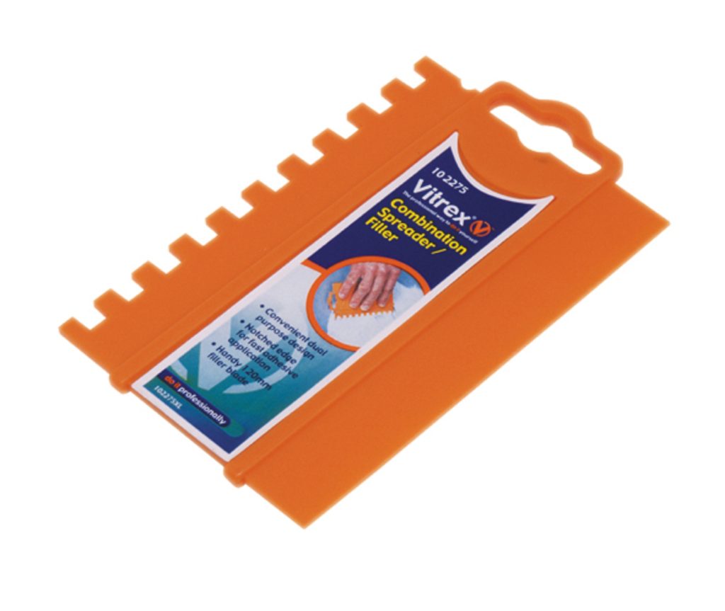 The Vitrex Combi Spreader & Filler is a versatile, dual-purpose tool designed to streamline both tile adhesive application and surface filling. Featuring a notched edge for efficient and even adhesive spreading and a 120mm filler blade for applying and smoothing fillers, this tool is perfect for tiling projects, plaster repairs, and general home improvement tasks.