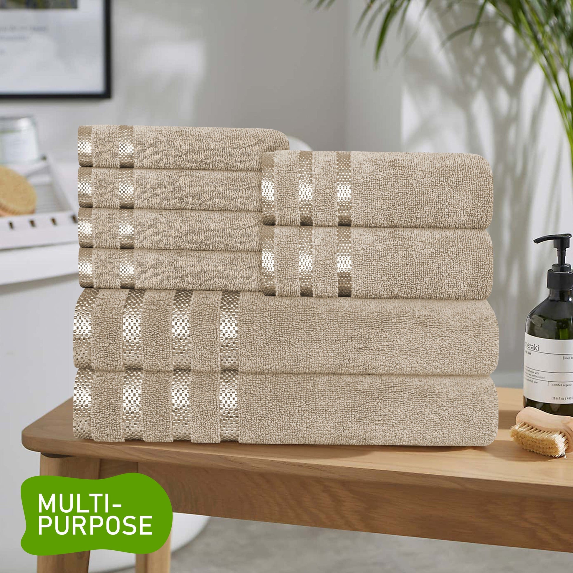• 10-Piece Towel Bale Set: A complete set for a full bathroom refresh. Includes 2 Bath Towels, 2 Hand Towels, 2 Gloves, 4 Face Cloths.