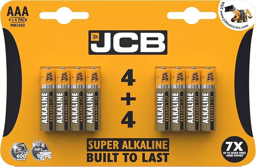 The JCB Super Alkaline 4 Plus 4 Battery Pack offers exceptional value and dependable performance. This 8-pack includes four batteries plus four additional free batteries, delivering long-lasting power for everyday household and office devices. Available in both AA and AAA sizes, these alkaline batteries are ideal for powering a wide variety of electronics, from remote controls and clocks to toys, wireless accessories, and more.